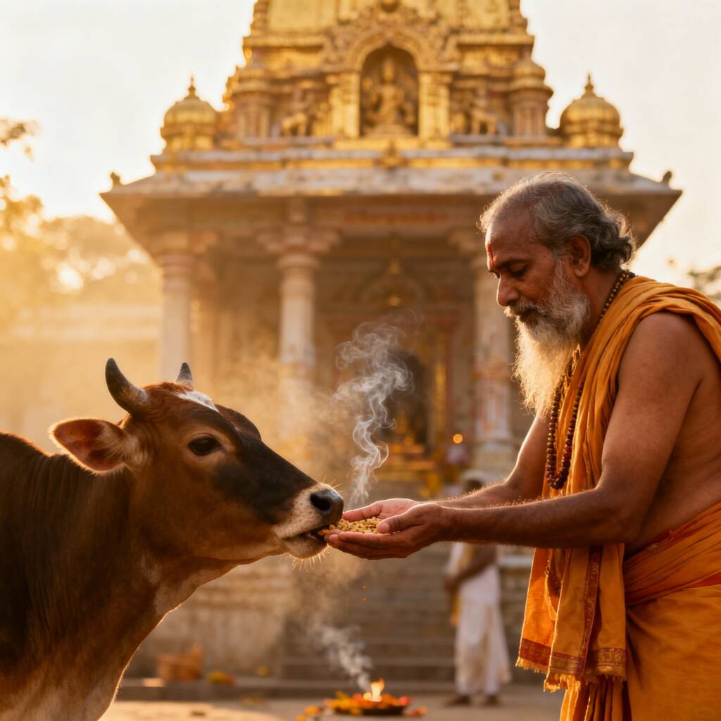 Cow service holds great significance in Sanatan Dharma. According to Hindu scriptures, the cow is revered as a mother, and serving her brings spiritual merit to devotees(see the generated image above). Under the guidance of our Panditji, regular Gau Seva is organized – providing food, health care, and shelter for the cows. If you wish to earn spiritual blessings, you are welcome to participate in this auspicious service.